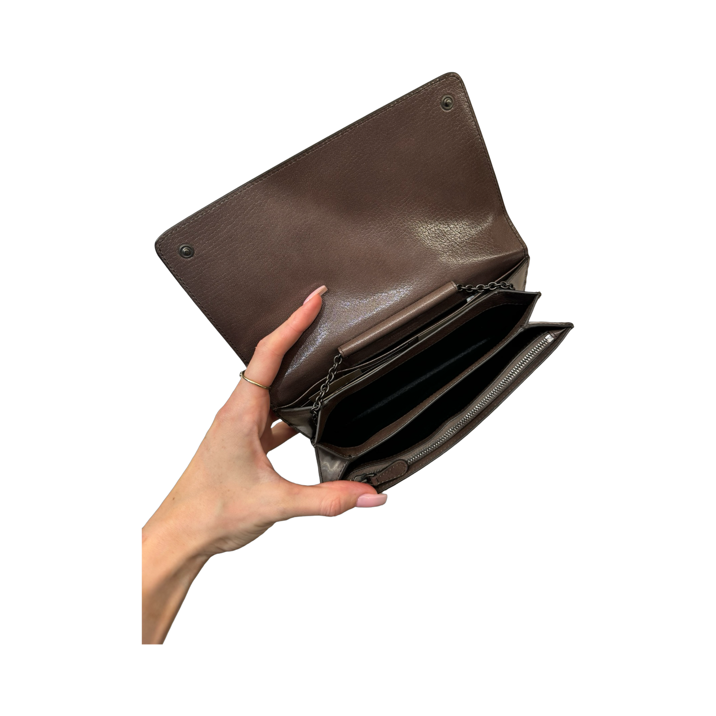 Chain-link strap which can also be hidden inside if you wanted to use it purely as a wallet